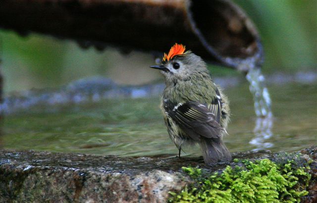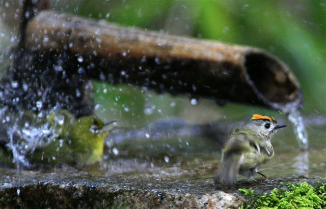オスの水浴び 水浴びの中ごろ、冠羽が膨れ始めている 左ではメジロが水浴びをしている