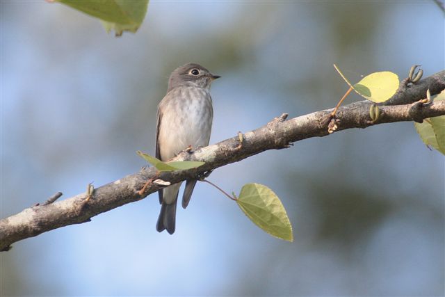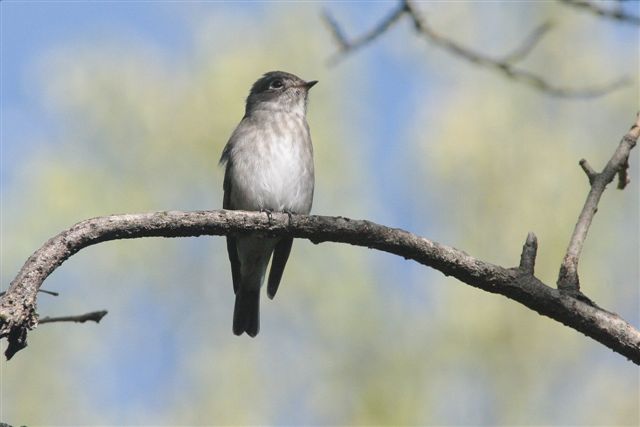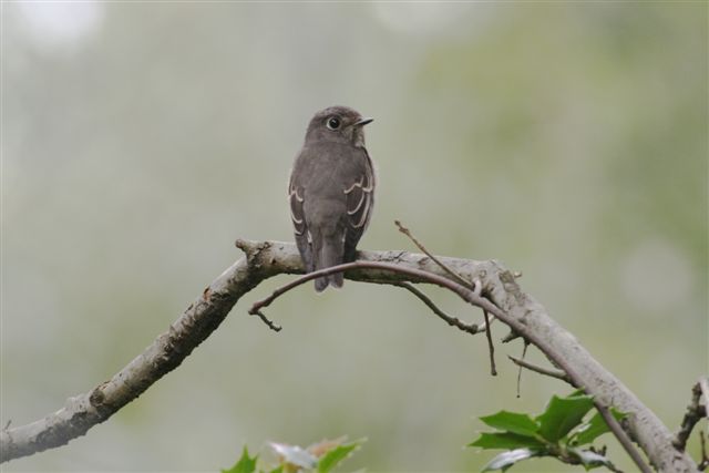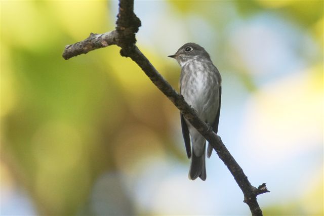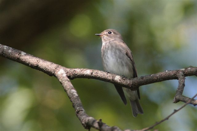 サメ2 木陰であるので、胸の斑がハッキリしていて、エゾビタキの斑と見間違えるほど。下尾筒の先端と翼の先端は尾羽の1/2に届き、なお翼と尾羽との間には隙間があり、翼はダラリとしている。嘴は幅広で短く感じられる。(08/ 9/24 植 物園)