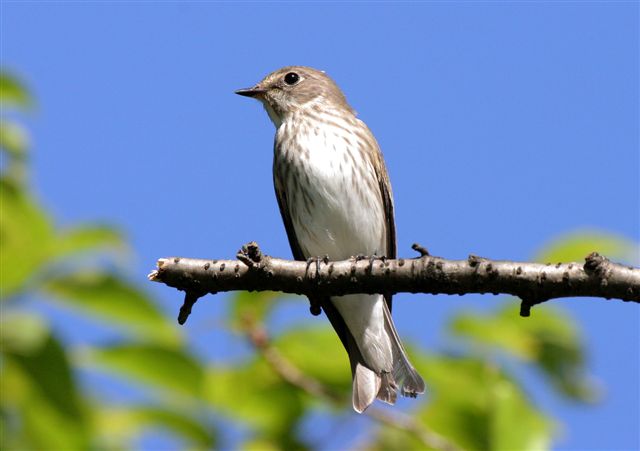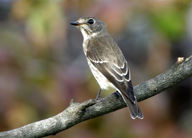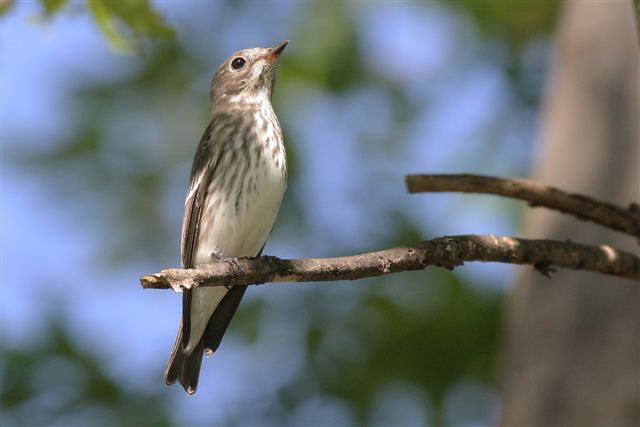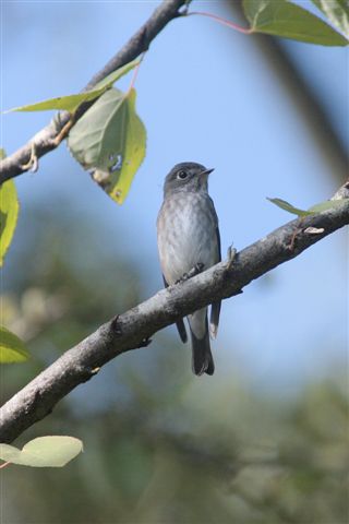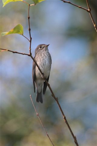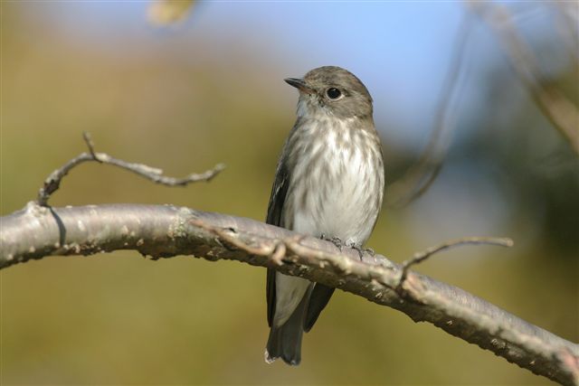 エゾ1 典型的なエゾビタキ。縦斑はハッキリしている。下尾筒の先端は尾の2/3までとどき、翼の先端もそこまで届いている。翼はキチッとたたまれていて隙間が見えない。とても長い。すばらしい流線型だ。(04/10/ 1 北区鴨川河 畔)