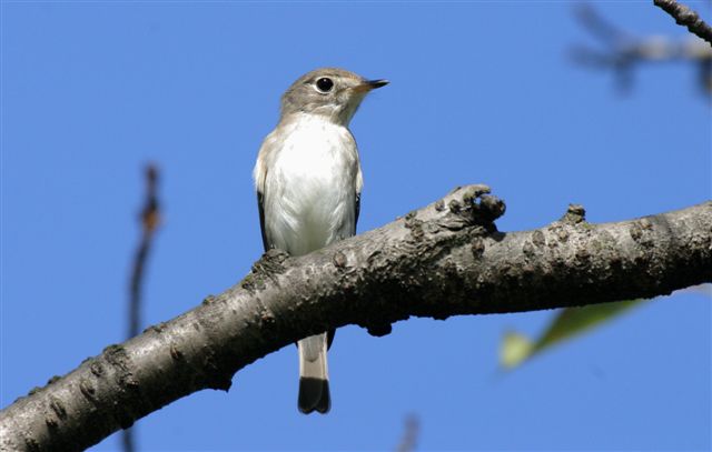 サメ3 陽光を受け胸はハレーションを起こしている。コサメビタキの胸部のようだ。翼先端とは尾羽との間に隙間があり、翼はダラリとしている。嘴は短く見える。(08/ 9/24 植物園)