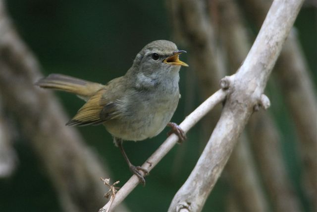 ウグイスのさえずり  ちょうどホーホケキョと鳴いたところ。口の中は肉色であった