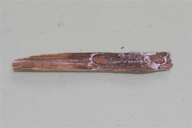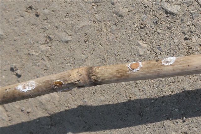B-2 葦の茎の皮はむかれている、茎は黒く変色し、白い粉状物質がところどころ付着している