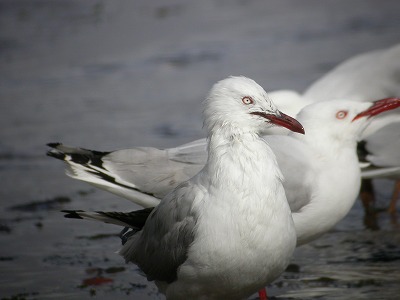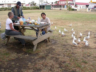写真28 Silver Gull が飛んできてたべた。スーパーで買った、ビスケットを6っ位に割ってなげると、2羽が10羽 20羽とどんどん飛んできて、中には取り合いになって、中止。食料をかたづけて走りました。