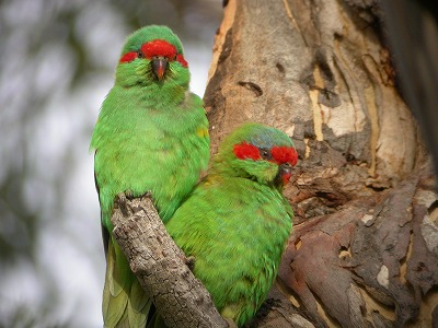 が近くの木に1羽いると、知らせました。全体が緑色で、額と目の横が赤いインコです。
