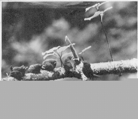 何時の間にか抱卵から巣立ち間近い雛となり懐中電灯の閃きに驚いた為か五羽の雛は残らず巣外に飛び出して草むらに姿をかくした。そのあと幾度か巣に戻してやったが結局不可能であった。漸くのことで親鳥が舞戻って其の様子に当惑する風情をカメラと共に見守り続けた。草むらの雛を一羽づゝ寫真の示す様に樹上に誘導させて四時間半後元の巣に全部帰ったのは夕刻近くであった。