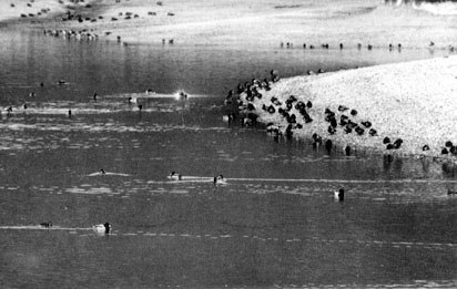 過日会友久保忠雄氏よりの知らせによりますと兵庫県小野市郊外の男池(通称鴨池)は本年は水漏れ改修工事のため、干上がって池底を露わしている状態とのこと。小生二年前の一月初旬に観察の折は近年稀な鴨の大群にて周囲約4粁あまりの池面にはマガモを始めコガモ・オシドリ・ガンなどそれらの数の多いのに驚かされました。