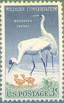 約50日后の7月12日にこのツルの一家は再びトップ記事となった。このときには二雛が成育し、両親を中央に一家四羽ずれで散歩している姿であった。これまで育てばもうあと成鳥にまで育てあげる見込がついたとあった。私はこのフラウピング・クレンの一家の消息が如何に大きなニュース・バリューをもっているかとゆうことにおどろいたのであったが、はたしてその年の自然愛護シリーズの切手の図案にはこのツルの一家がとり上げられた。その図案は動物画家として名のあるボブ・ハイネス氏の筆になるもので、孵化后間もない二羽の雛にジョセフィン夫人が愛情をそそぎ、背后にクリック氏が見張りに立っている姿である。アメリカの切手はほとんど単色刷りであるが、三色刷りはたしかこの切手がはじめてであったと思う。